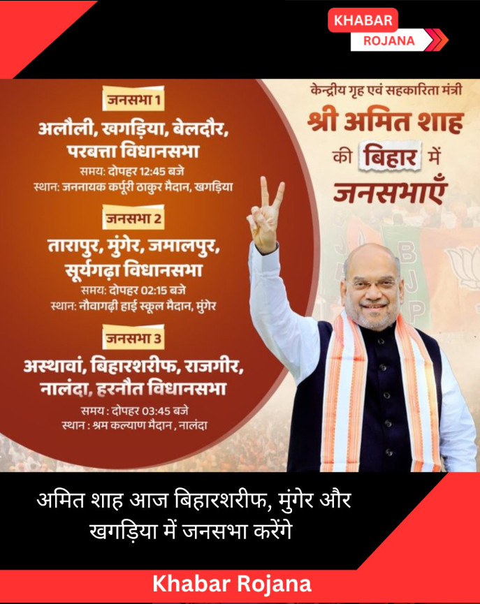 अमित शाह बिहार दौरे पर:केंद्रीय गृह मंत्री अमित शाह आज बिहार में सक्रिय रहेंगे। वे बिहारशरीफ, मुंगेर और खगड़िया में जनसभाओं को संबोधित करेंगे।