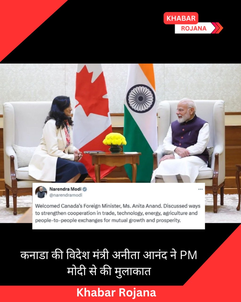 कनाडा की विदेश मंत्री अनीता आनंद इन दिनों अपने भारत के दौरे पर हैं। यहां उन्होंने सोमवार को प्रधानमंत्री नरेन्द्र मोदी से मुलाकात की। इस मौके पर पीएम मोदी ने कहा कि उनकी भारत यात्रा से द्विपक्षीय साझेदारी को नयी गति मिलेगी। पीएम मोदी ने सोशल मीडिया प्लेटफार्म एक्स पर कनाडा की विदेश मंत्री के साथ मुलाकात की तस्वीरें शेयर की हैं। पीएम मोदी ने तस्वीरें शेयर करते हुए लिखा, ‘कनाडा की विदेश मंत्री अनीता आनंद का स्वागत किया। व्यापार, प्रौद्योगिकी, ऊर्जा, कृषि और आपसी विकास एवं समृद्धि के लिए लोगों के बीच आदान-प्रदान में सहयोग को मजबूत करने के उपायों पर चर्चा की।’