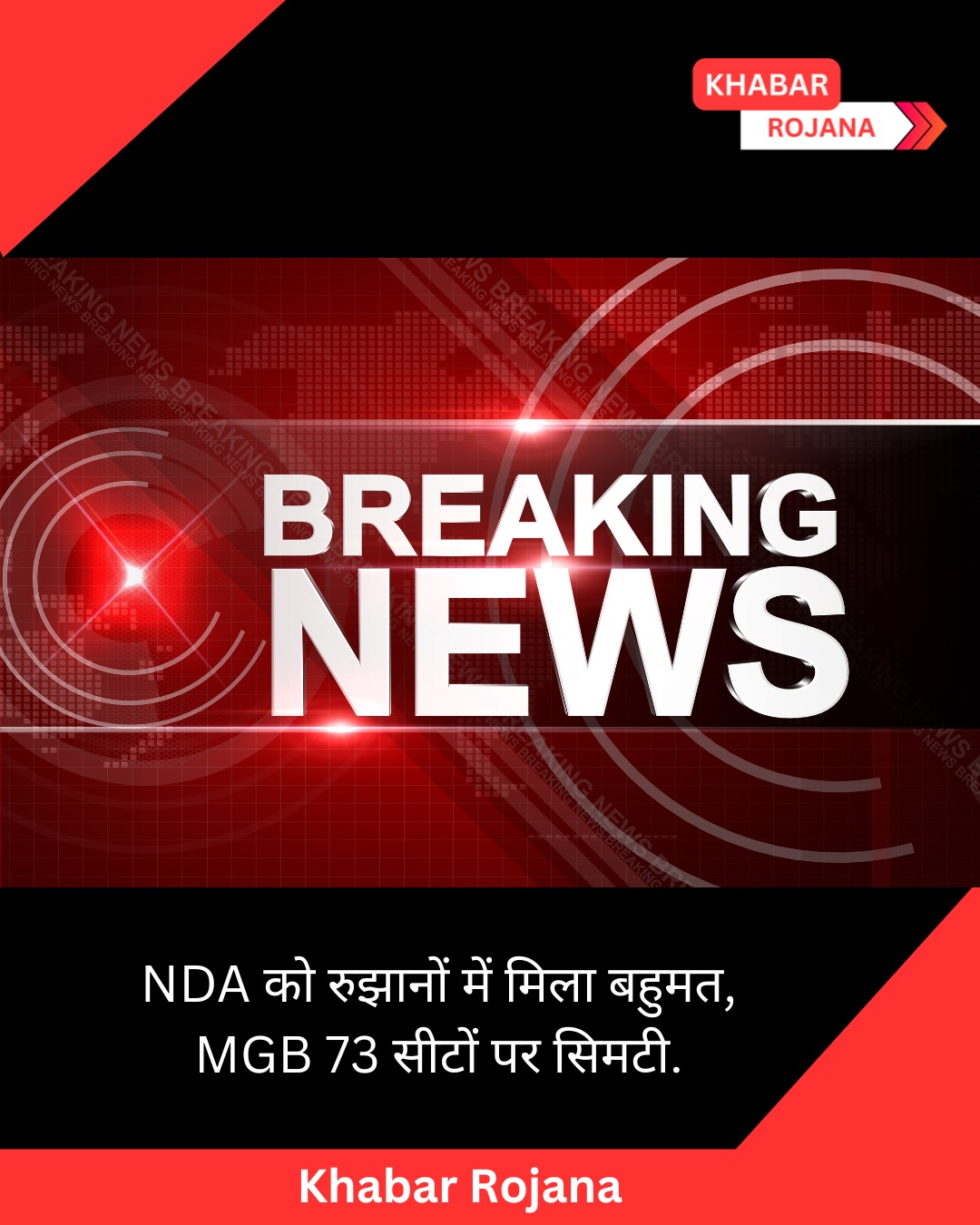 “बिहार विधानसभा चुनाव के शुरुआती रुझानों के अनुसार, राष्ट्रीय जनतांत्रिक गठबंधन (NDA) को बहुमत मिलने की संभावना है। वहीं, महागठबंधन (MGB) का प्रदर्शन अपेक्षाकृत कमजोर नजर आ रहा है और उसकी सीटें लगभग 73 तक सिमटी हुई दिखाई दे रही हैं। इन रुझानों से साफ संकेत मिलता है कि एनडीए की स्थिति मजबूत बनी हुई है, जबकि MGB अपने जनाधार को बढ़ाने में सफल नहीं हो पाया है और मुकाबला अपेक्षाकृत एकतरफा दिखाई दे रहा है।”